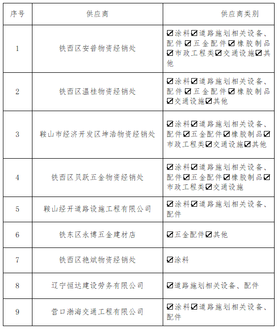 根據(jù)2024年5月11日發(fā)布的《供應(yīng)商入庫(kù)公告》要求,經(jīng)過(guò)報(bào)名篩選和資質(zhì)審查等程序,確定了9家供應(yīng)商符合入庫(kù)條件?,F(xiàn)公布經(jīng)過(guò)篩選的供應(yīng)商入庫(kù)清單,名單如下: